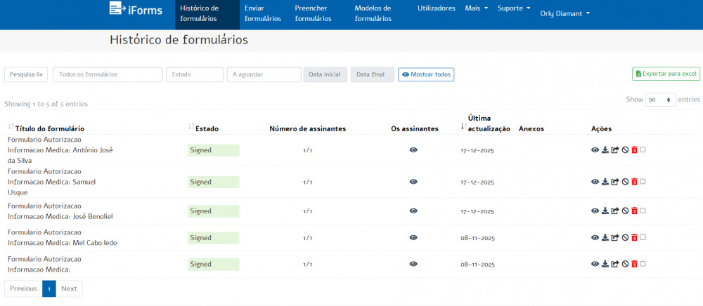 Todos os formulários preenchidos e assinados são enviados para o e-mail que especificou e ficam também guardados no histórico do formulário: